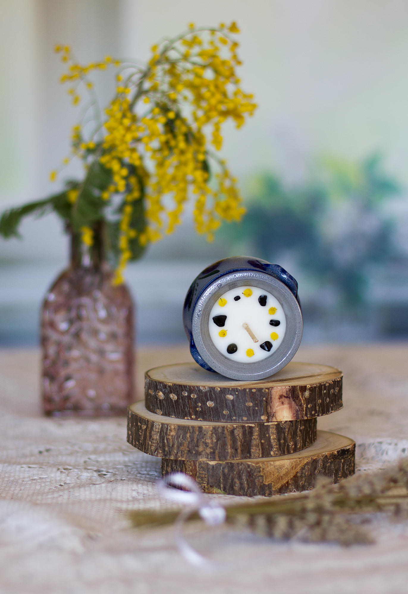 Décor : mini pierres roulées d’obsidienne, pompons de mimosa