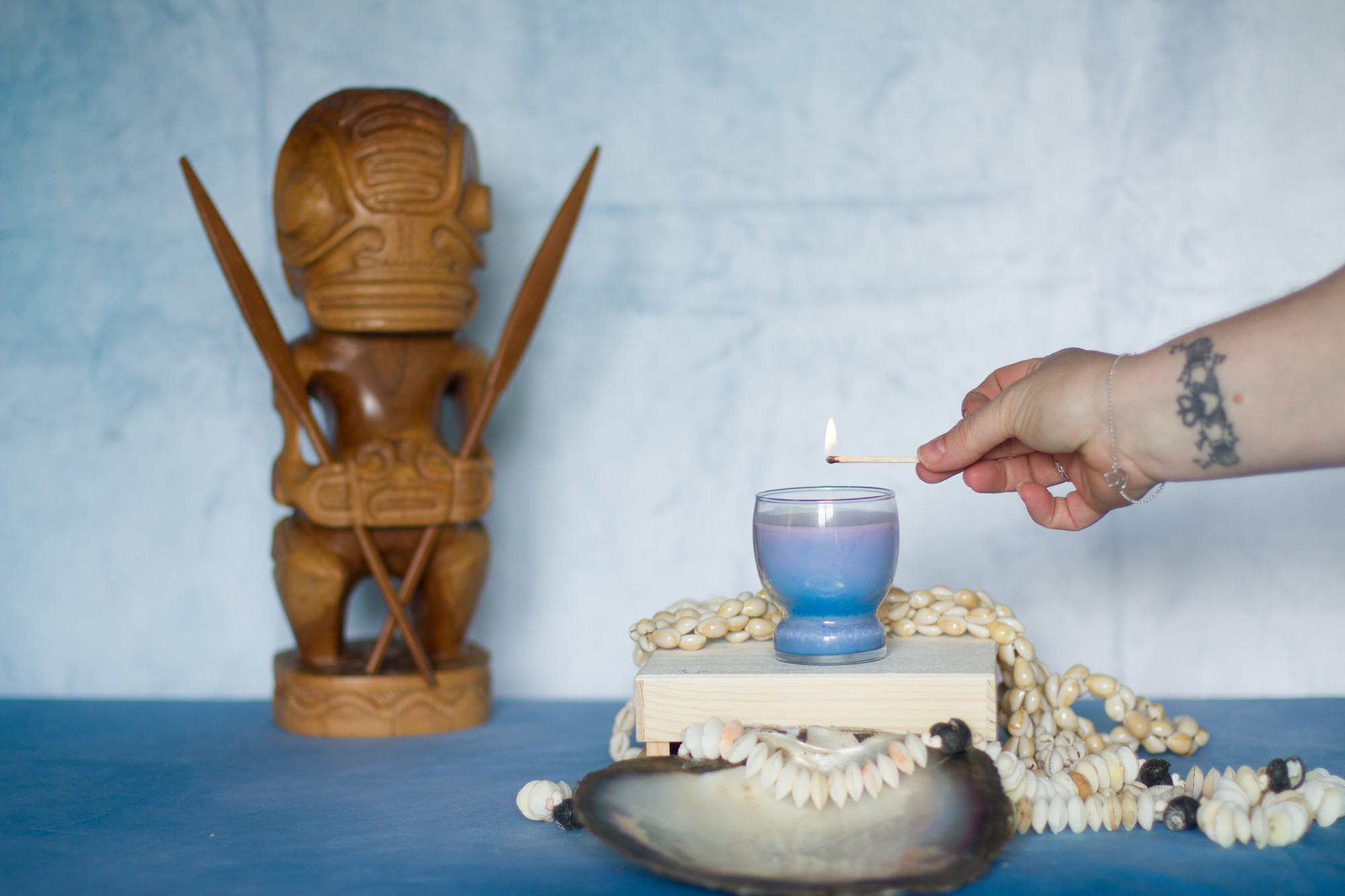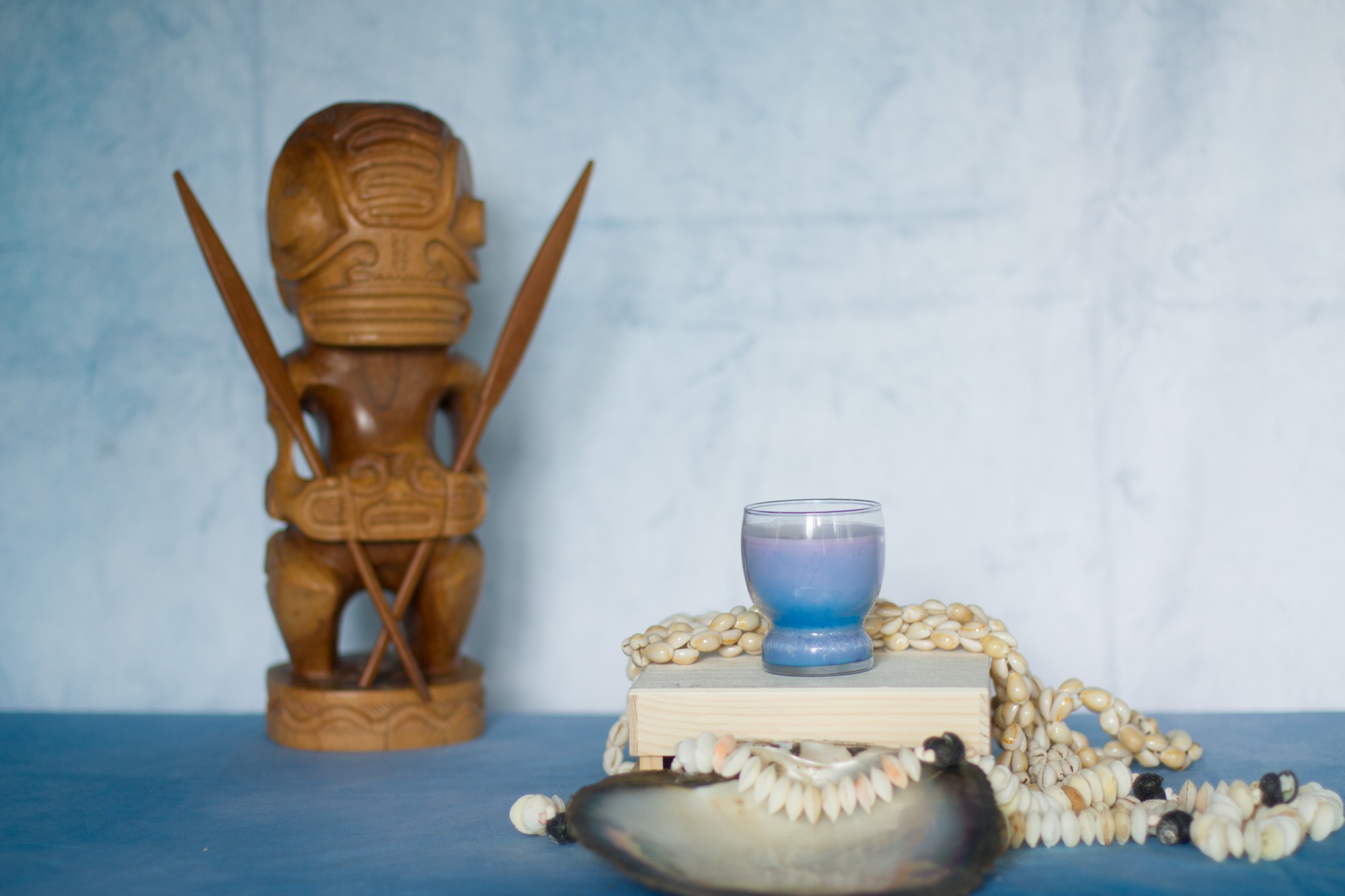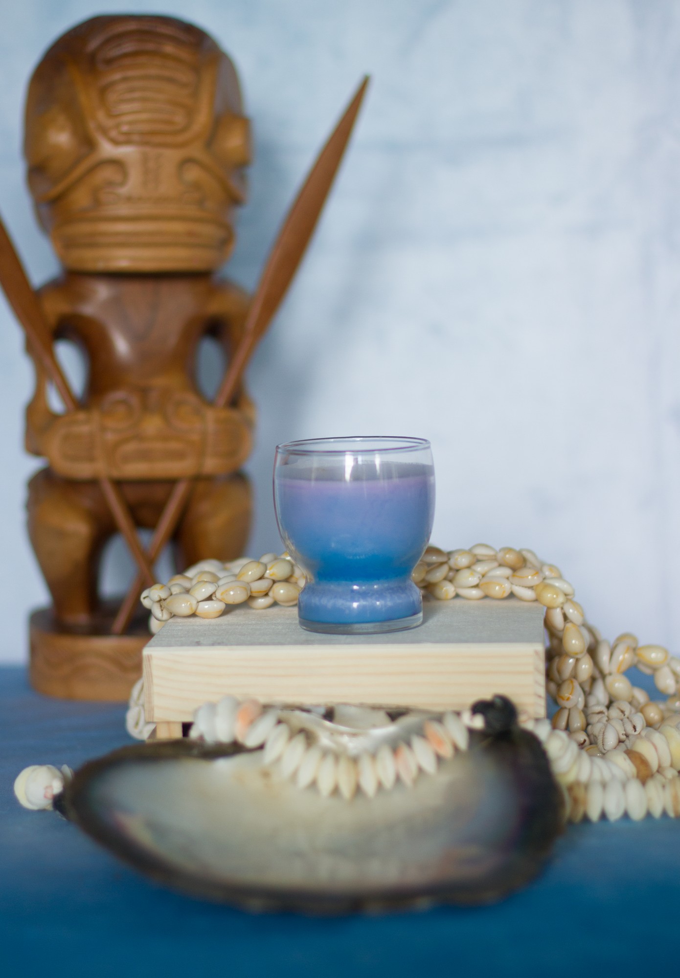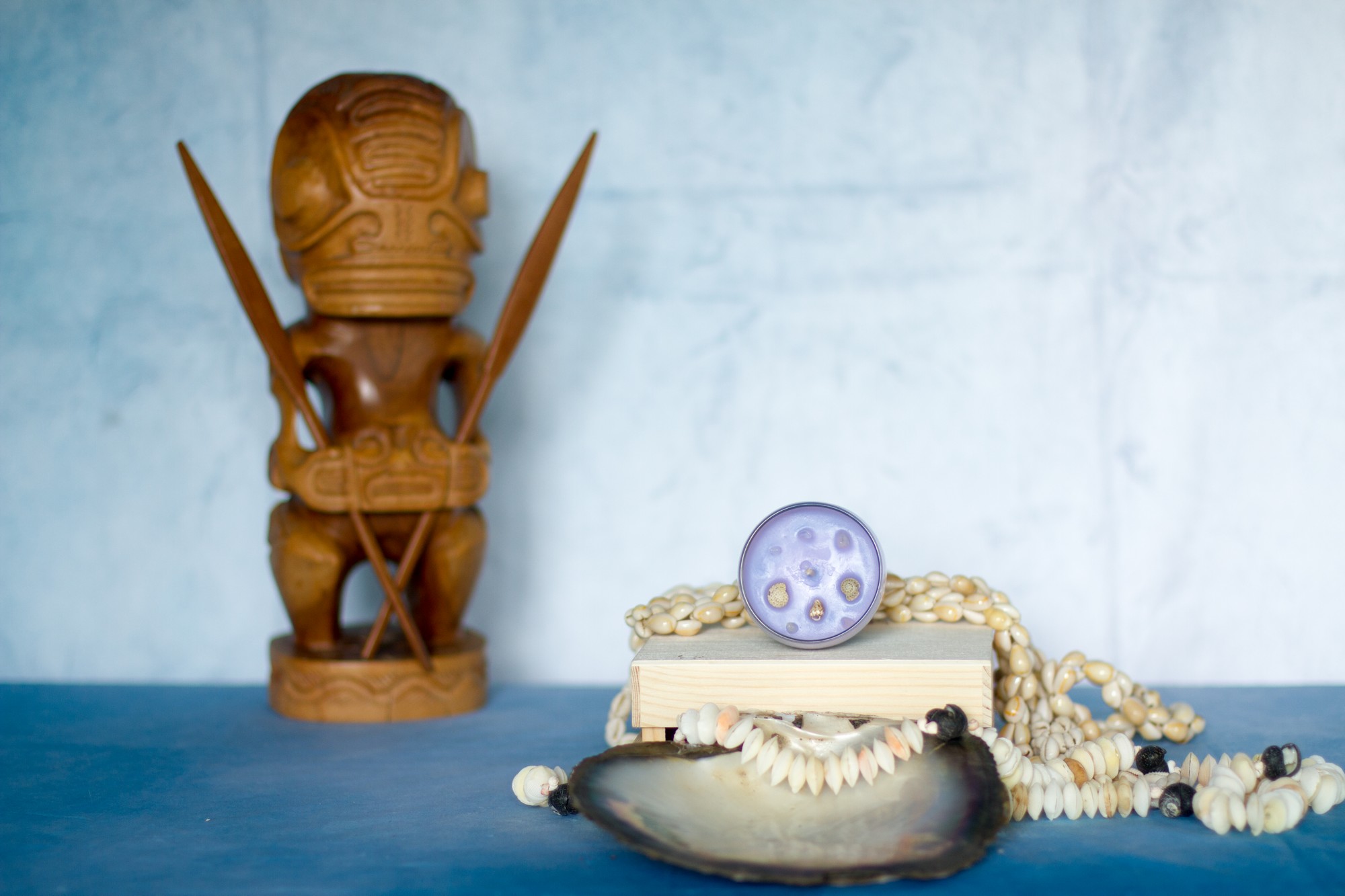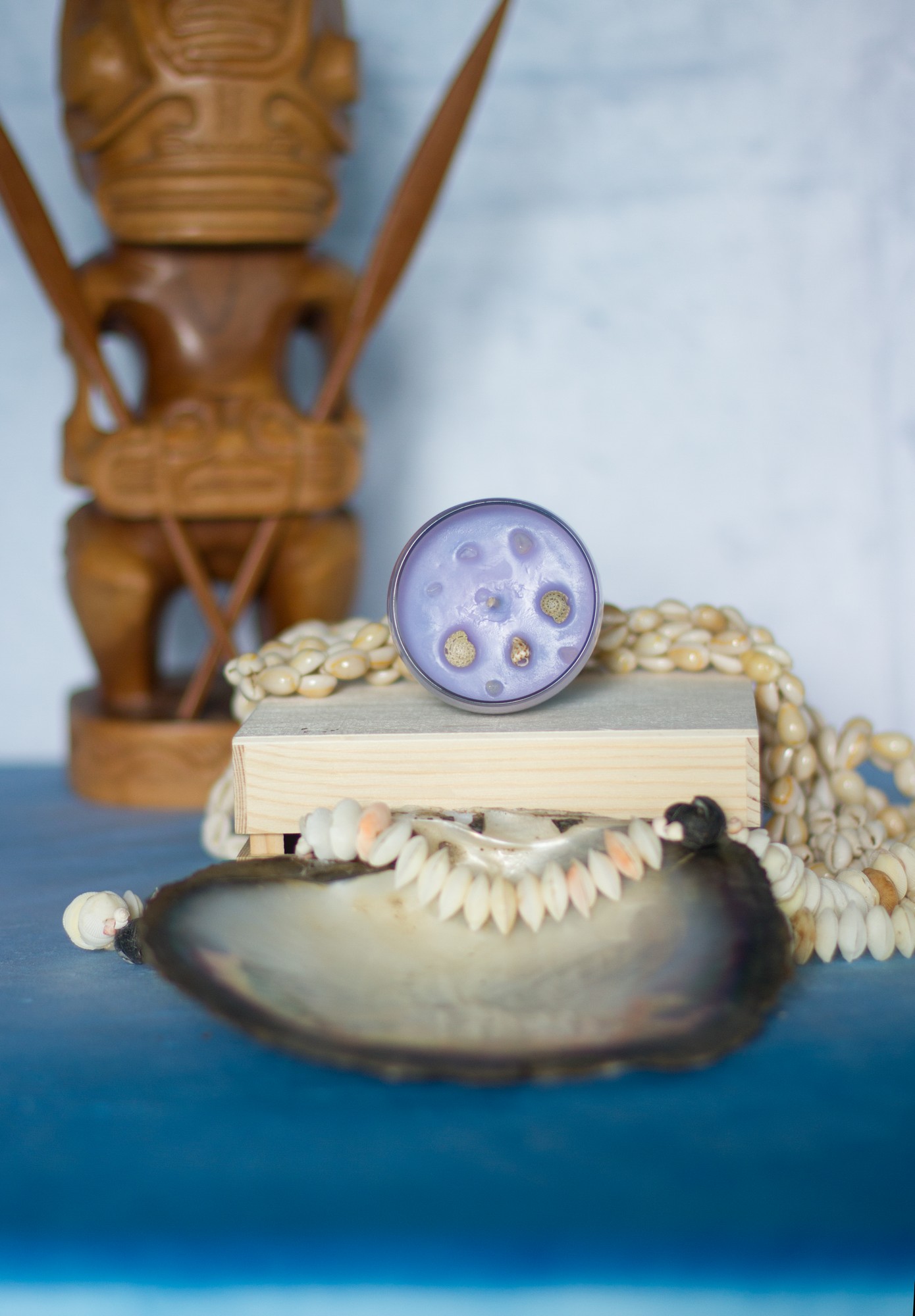 Les coquillages qui décorent la bougie proviennent des colliers qui nous ont été offert à chaque fois que nous quittions un hôtel (dans la tradition polynésienne, l’accueil est très important : à chaque fois que l’on arrive quelque part, un collier de fleurs fraiches et parfumées nous est passé au cou, et à chaque départ, ce sont des colliers de coquillages).