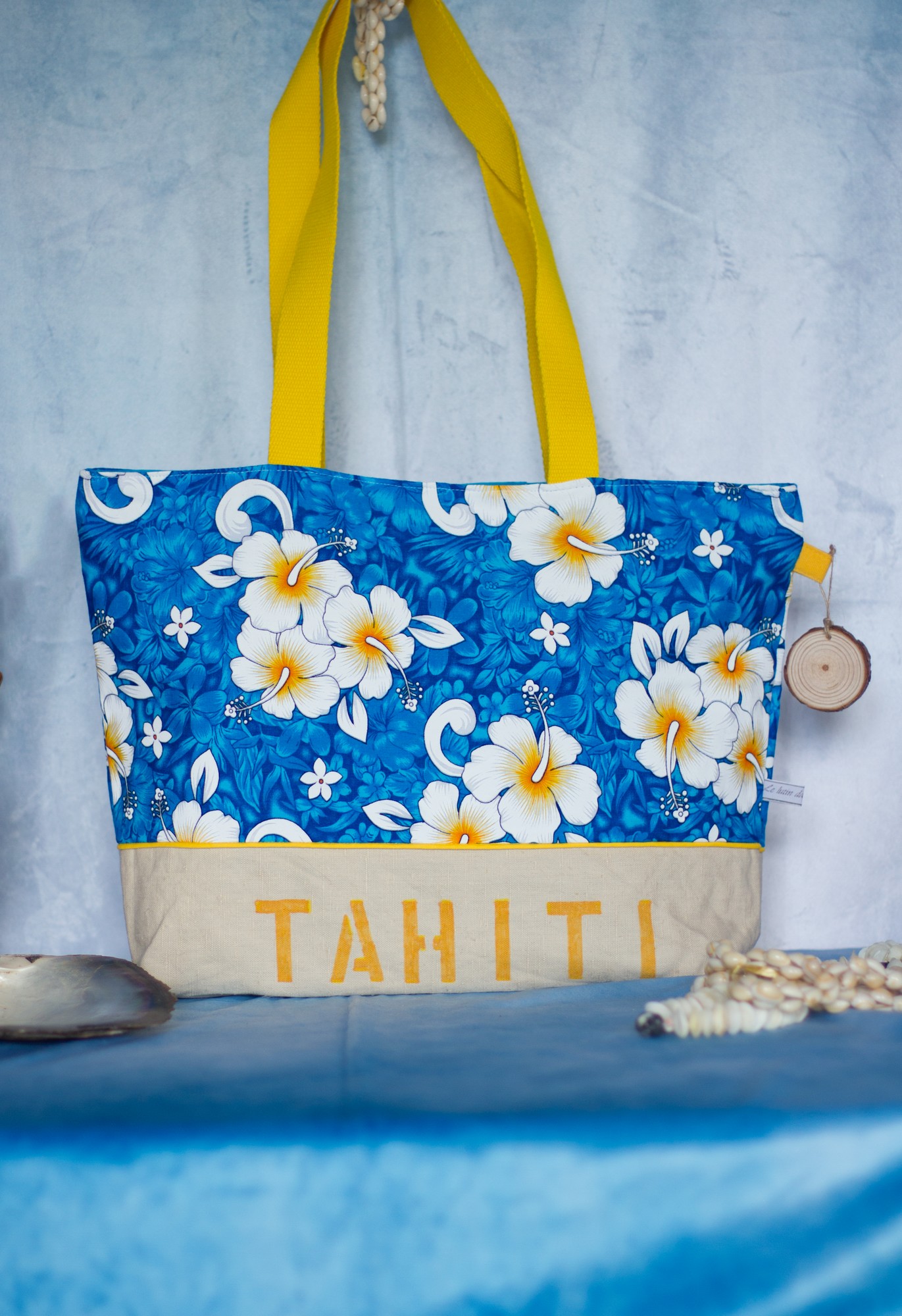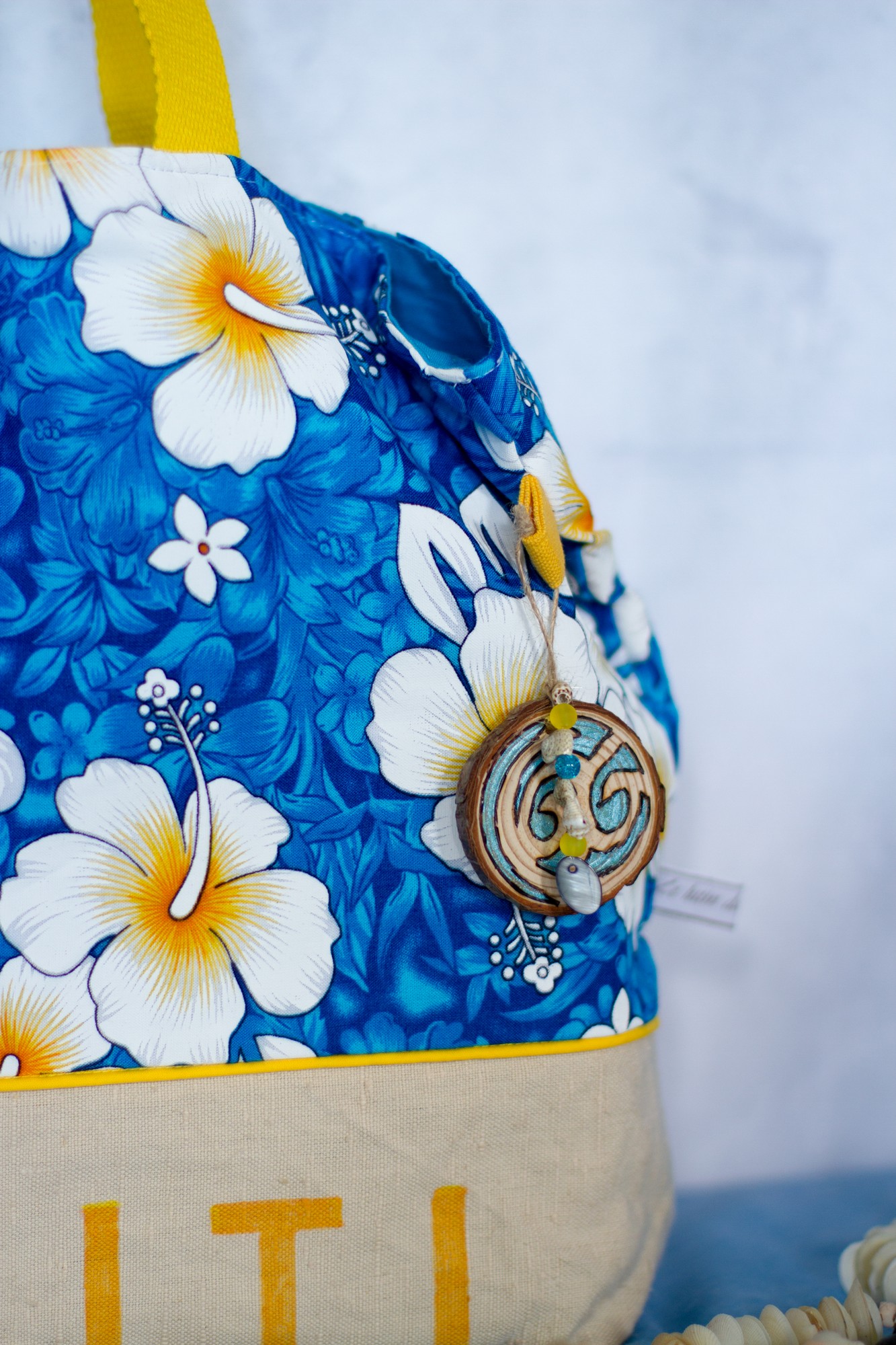 Ce sac est orné d’un petit gri-gri en bois pyrogravé de mes mains d’un symbole coloré à l’aquarelle et rappelant le mouvement perpetuel des vagues, et de coquillages récupérés des nombreux colliers qu’on nous a offert (dans la tradition polynésienne, l’accueil est très important : à chaque fois que l’on arrive quelque part, un collier de fleurs fraiches et parfumées nous est passé au cou, et à chaque départ, ce sont des colliers de  coquillages).