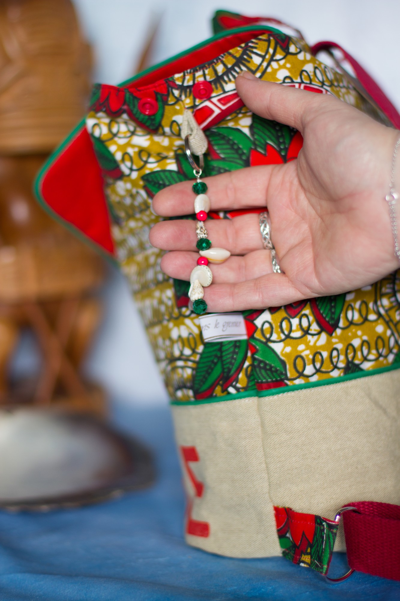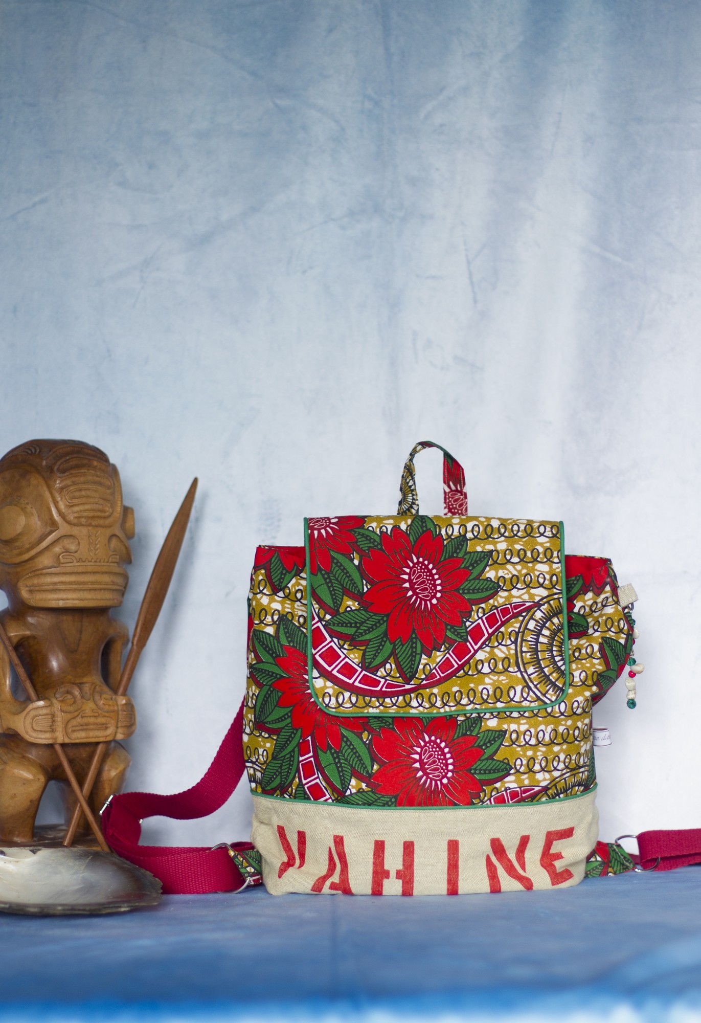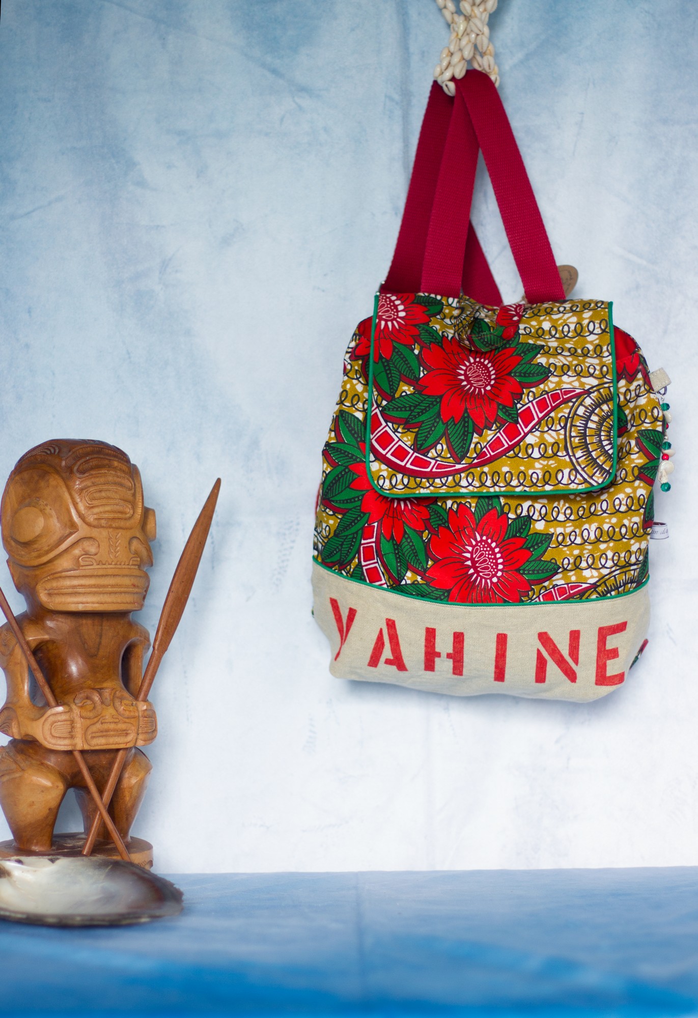 Le sac est orné d’un grigri en perles de verre et coquillages récupérés des nombreux colliers qu’on nous a offert (dans la tradition polynésienne, l’accueil est très important : à chaque fois que l’on arrive quelque part, un collier de fleurs fraiches et parfumées nous est passé au cou, et à chaque départ, ce sont des colliers de coquillages).