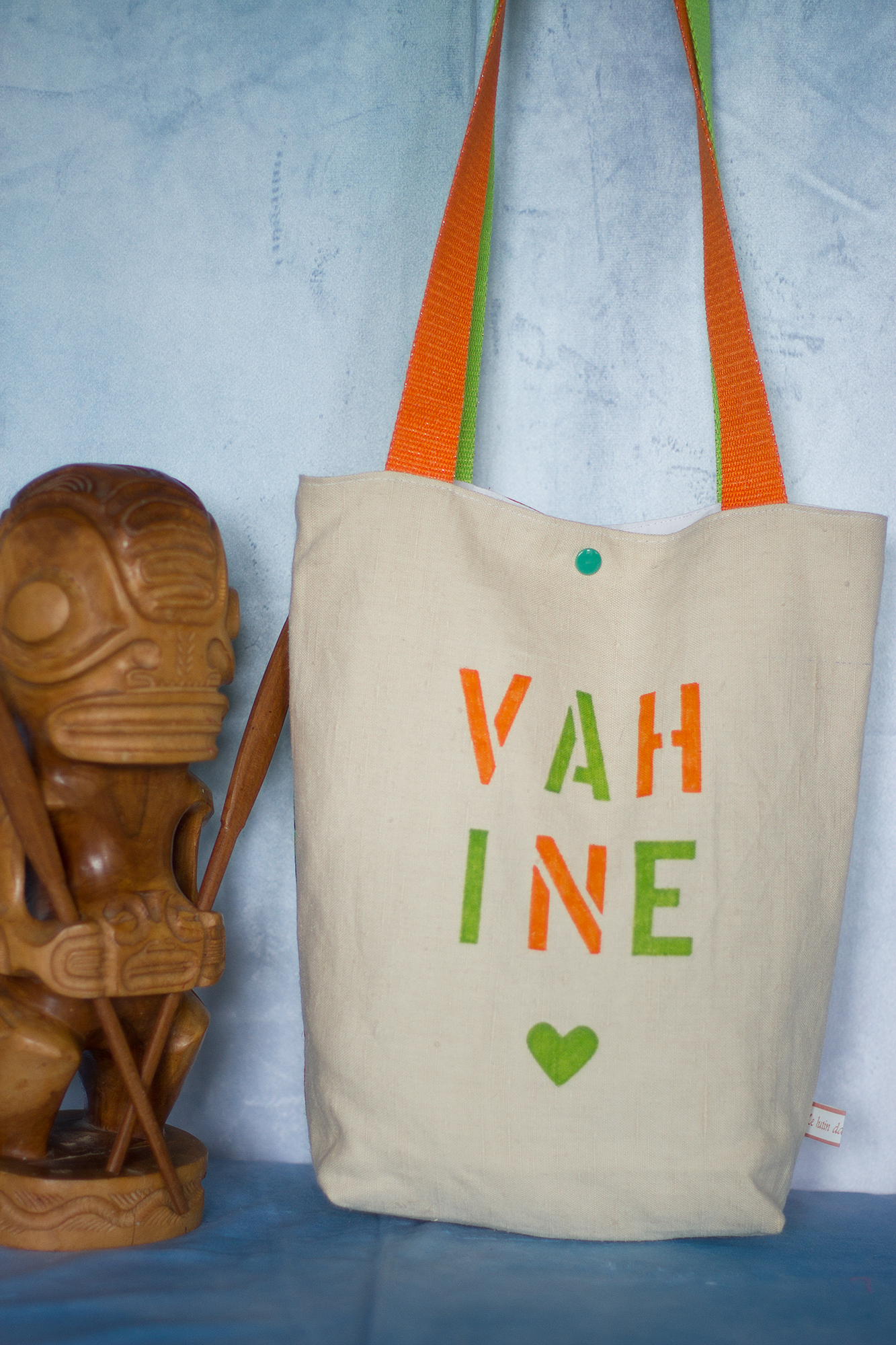 Le dos du sac est peinte au pochoir du mot « vahine » qui signifie « femme».